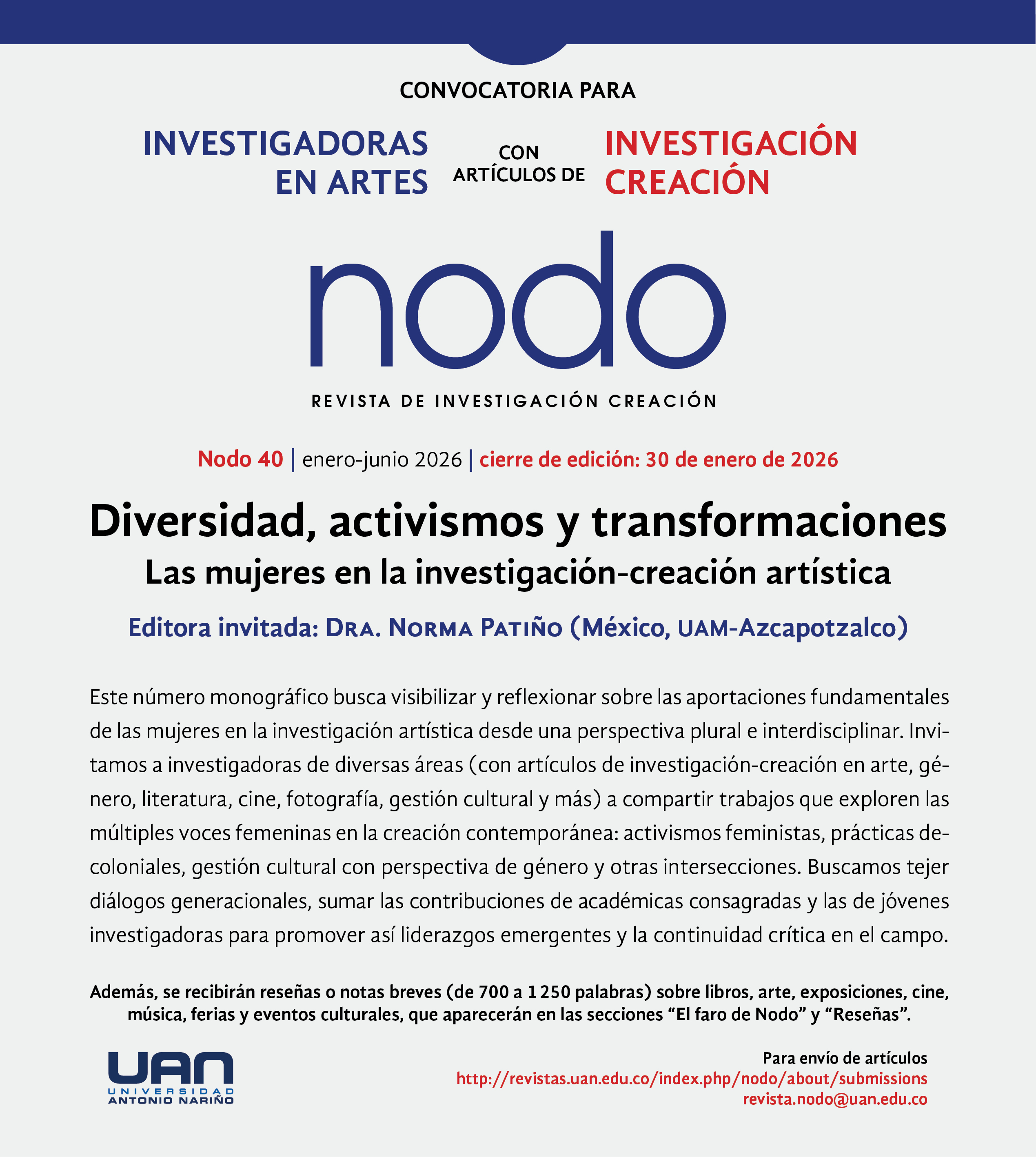 La revista nodo es una publicación semestral editada por la Facultad de Artes y la Vicerrectoría de Ciencia, Tecnología e Innovación (VCTI) de la Universidad Antonio Nariño (UAN), en Bogotá, Colombia. Publica artículos de investigación y creación científica y tecnológica, de reflexión y de revisión en artes y humanidades, con ejes transversales como ciudad, industrias creativas y culturales, estéticas emergentes, procesos derivados de la investigación creación que, desde estructuras disciplinadas y planificadas, generen nuevos conocimientos, desarrollos tecnológicos e innovaciones aplicados a temas coyunturales que impactan a las sociedades en general.